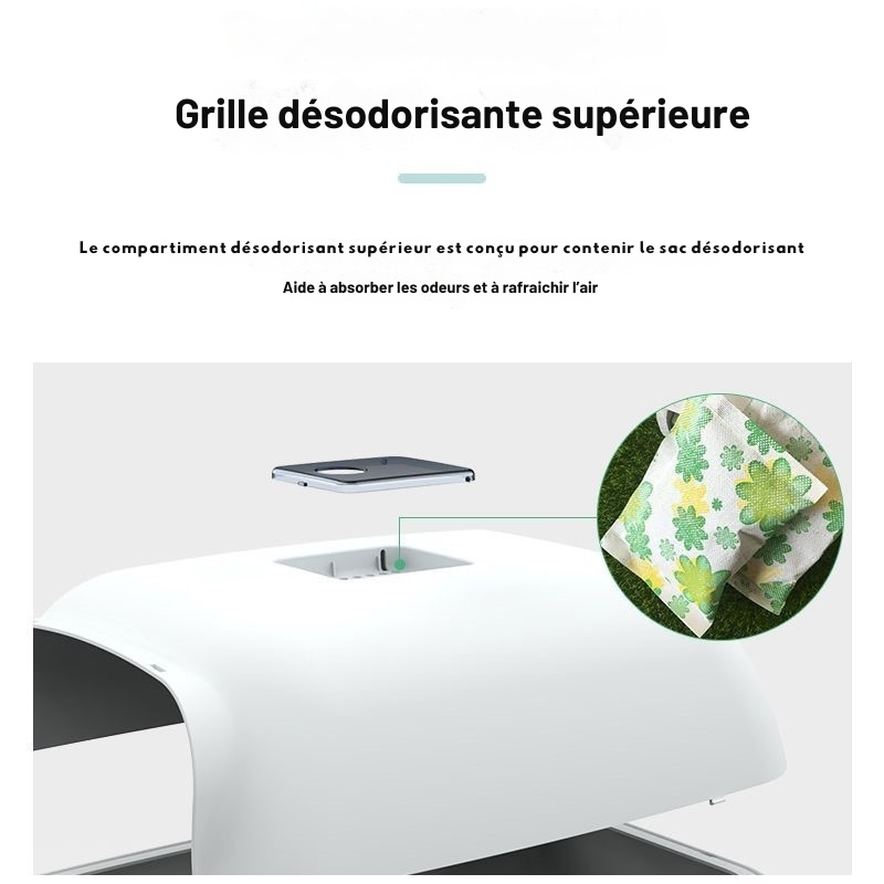 - Grille supérieure : retient la litière sous les pattes de votre chat à la sortie